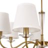 Металлическая арматура в двух оттенках на выбор: латунь и никель. Абажуры – текстиль белого цвета. Декоративные элементы из прозрачного стекла. Источник света – лампа с цоколем E14.
