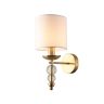 Материал абажура — ткань, цвет — белый. Металлическая арматура в цвете латунь обрамлена хрустальными бусинами. Источник света — лампы с цоколем Е14. Степень защиты — IP20.