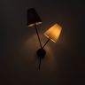 Арматура - металл, цвет — чёрный. Декоративные крепления и вставки цвета латуни. Тканевые абажуры в форме конуса из микса теплых цветов: бежевый и коричневый. Открытые верхние основания абажуров пропускают дополнительный свет. Динамичный дизайн в стиле Casual. Источник света — лампа с цоколем Е14.
