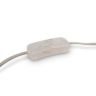Металлическая арматура в цвете латунь. Дополнительные элементы — минималистичные вставки из натурального белого мрамора. Белые абажуры из ткани в форме конуса. Источник света — лампа с цоколем Е14 или Е27.
