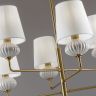 Металлическая арматура, цвет - латунь. Керамические декоративные элементы. Матовые белые абажуры. Силуэт светильника вытягивает интерьер. Источник света — лампа. Цоколь E14.