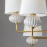 Металлическая арматура, цвет - латунь. Керамические декоративные элементы. Матовые белые абажуры. Силуэт светильника вытягивает интерьер. Источник света — лампа. Цоколь E14.