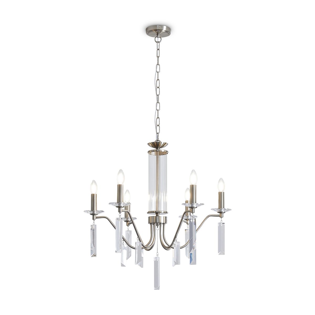 Материал арматуры — металл, цвет — никель или латунь. Подвесные светильники с цоколем E14. Доступны с пятью или шестью источниками света. Грани хрустальных подвесов создают эффект перелива радуги. Центральный декор из стеклянных трубок. Подходит для классических интерьеров.