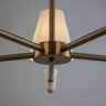 Металлическая арматура в цвете латунь. Дополнительные элементы — минималистичные вставки из натурального белого мрамора. Белые абажуры из ткани в форме конуса. Источник света — лампа с цоколем Е14 или Е27.