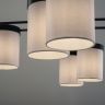 Арматура из металла. Основной цвет — чёрный, декоративные элементы в цвете латунь. Тканевые бежевые абажуры-цилиндры украшены чёрными металлическими основаниями. Компактные размеры для невысоких потолков. Источник света — лампа с цоколем Е14.
